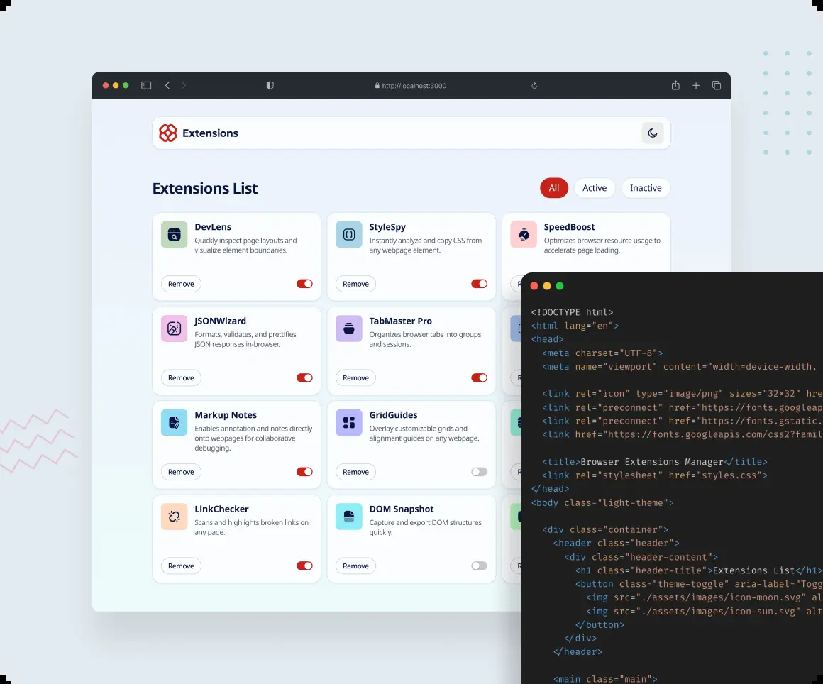 Pick from 100+ professionally designed projects across five skill levels—from HTML/CSS basics to full-stack applications.