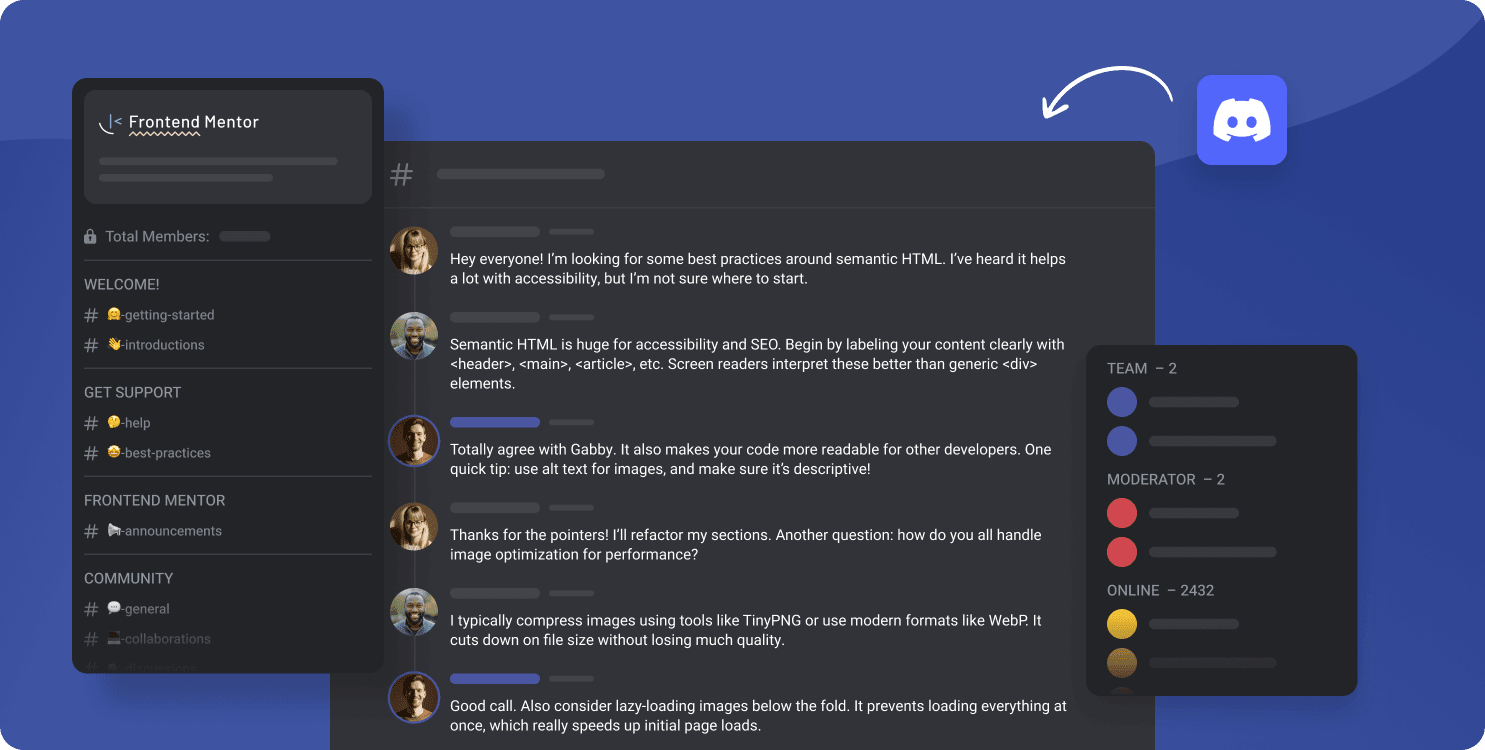 Join thousands of Frontend Mentor community members taking on challenges, sharing resources, helping each other, and chatting about all things code.