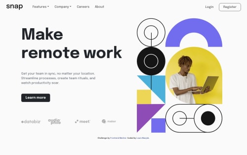 <section class="row p-lg-3 mobile-hero"> <!-- mobile hero img --> <section class="hero-img col-lg-6"> <img src="./images/image-hero-mobile.png" class="w-100" alt="" /> </section> <!-- mobile hero text --> <section class="hero-text text-center col-lg-6 mt-5"> <h1 class="display-5">Make remote work</h1> <p class="text my-4"> Get your team in sync, no matter your location. Streamline processes, create team rituals, and watch productivity soar. </p> <button class="btn btn-dark py-2 px-4 mb-4 rounded-3 learn-more">Learn more</button> <div class="row mt-5 justify-content-center align-items-center"> <div class="col-3 client"><img src="./images/client-databiz.svg" alt="databiz image"></div> <div class="col-3 client"><img src="./images/client-audiophile.svg" alt="audiophile image"></div> <div class="col-3 client"><img src="./images/client-meet.svg" alt="meet image"></div> <div class="col-3 client"><img src="./images/client-maker.svg" alt="maker image"></div> </div> </section> </section> <!-- desktop hero display --> <section class="row p-3 desktop-hero"> <section class="hero-text col-lg-6 align-self-center me-5"> <h1 class="display-1">Make remote work</h1> <p class="text-secondary my-5 w-75"> Get your team in sync, no matter your location. Streamline processes, create team rituals, and watch productivity soar. </p> <button class="btn btn-dark learn-more py-2 px-4 mb-5 rounded-3">Learn more</button> <div class="row mt-5 justify-content-center align-items-center"> <div class="col-3 client"><img src="./images/client-databiz.svg" alt="databiz image"></div> <div class="col-3 client"><img src="./images/client-audiophile.svg" alt="audiophile image"></div> <div class="col-3 client"><img src="./images/client-meet.svg" alt="meet image"></div> <div class="col-3 client client-maker"><img src="./images/client-maker.svg" alt="maker image"></div> </div> </section> <section class="hero-img col-lg-5"> <img src="./images/image-hero-desktop.png" class="w-100" alt="" /> </section> </section> -