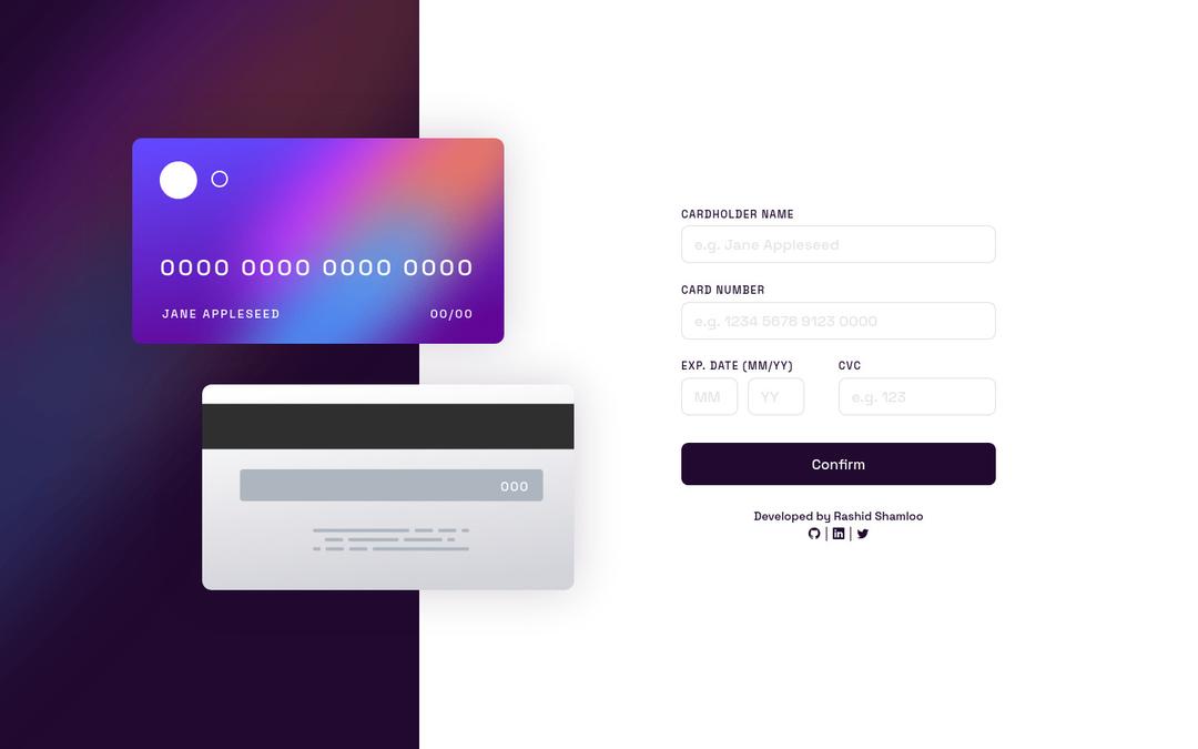 Submitted almost 3 years agoA solution to the Interactive card details form challenge