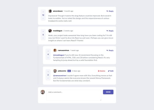 This project is incomplete. I'm posting it because I wanna see how other developers approached the same issues. The design wasn't a problem but the logic for adding new comments and replying existing ones was a bit difficult for me. Maybe it's because that was the first time I tried using TypeScript on a project, I don't know. I intend to keep on studying to learn how to solve the problems I couldn't during this challenge.