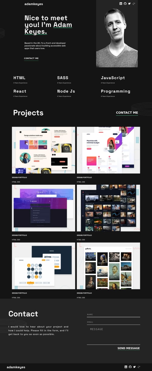 Problems caused by focusing on section too much: When I first started out building this project, the grid that lays out the hero-section was behaving very weird. I was so caught up in solving these hero-section grid problems that I did not plan the css-variables well from the figma file. This might have led to problems in typography. And this might have caused the "Adam Keyes two appear in two lines instead of one(as given in the figma file)."