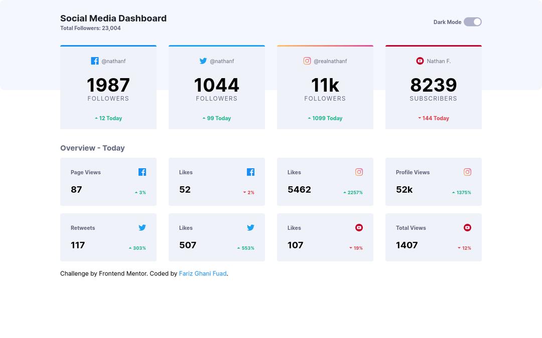 Social Media Dashboard With Dark Mode Toggle Using Tailwind CSS