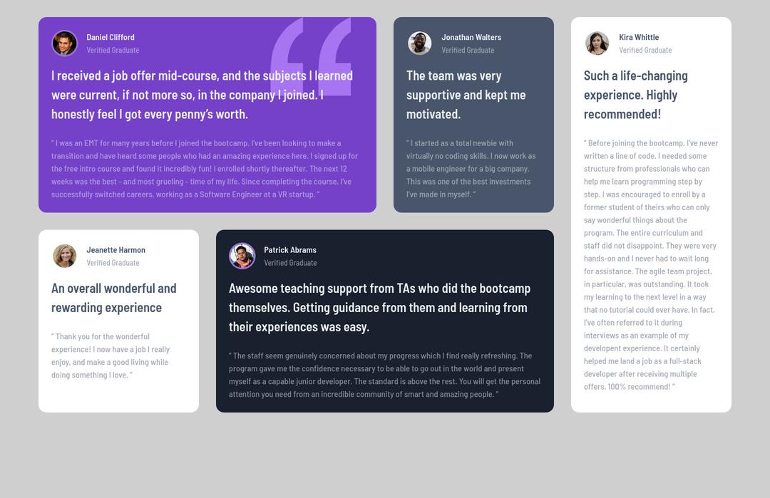 This is my submission for the "Testimonial grid section" project. It's been a lot of fun, but the trickiest thing for me was to make the style for the various cards as general and as DRY as possible. I ended up using css bem's notation, giving some specific styles to modifier classes like .card--violet, .card--white and so on. I'm pretty satisifed with the overall result.